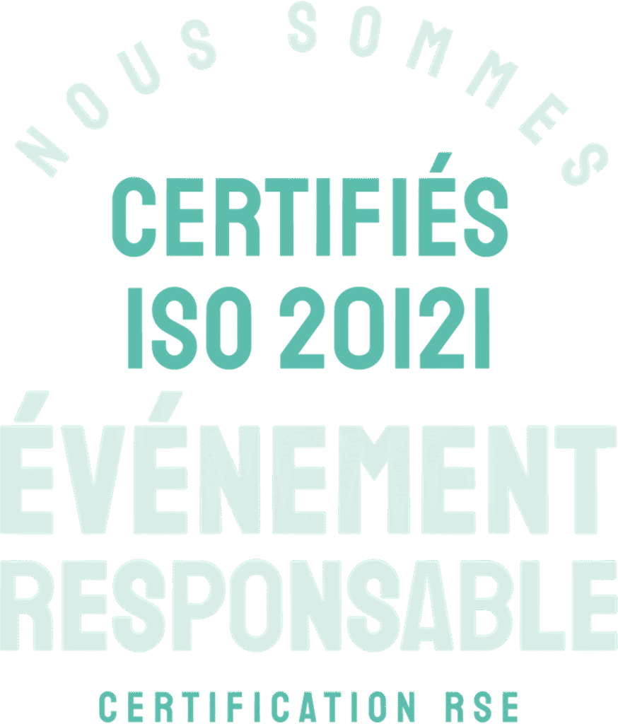 Nous suivons avec grande attention les lignes directrices de la norme ISO 20121 afin de maitriser au mieux l’impact social, économique et environnemental de nos évènements.